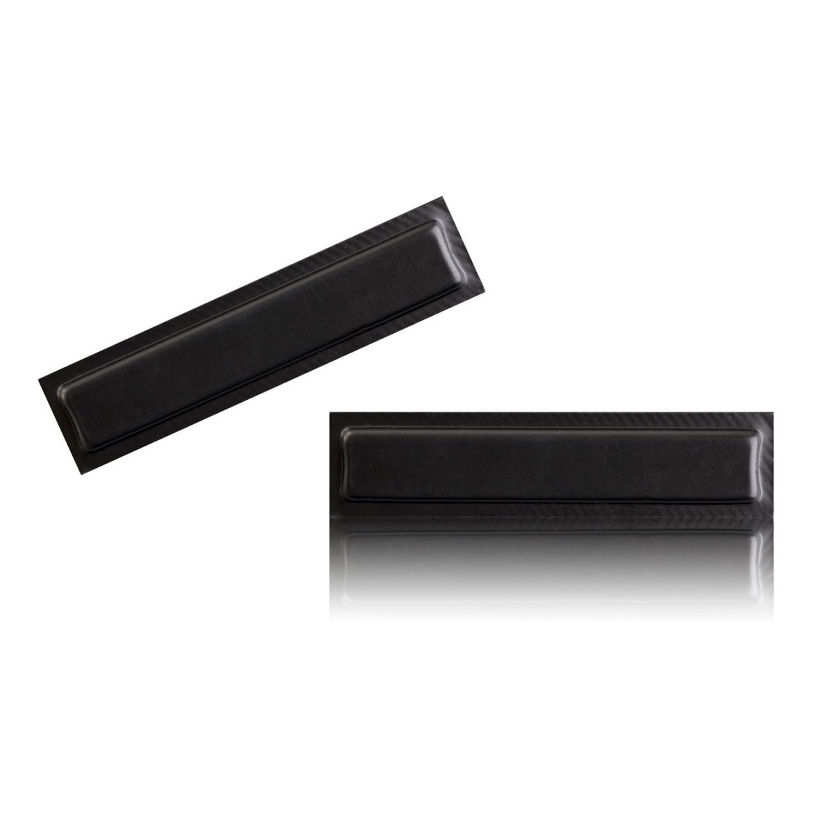 Duas caixas retangulares pretas com superfícies lisas sobre fundo branco.