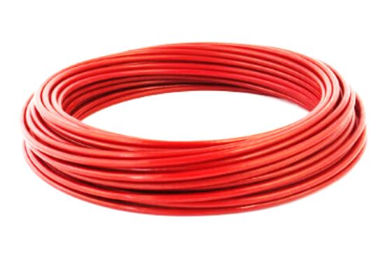 Rolo de cabo elétrico vermelho enrolado sobre fundo branco