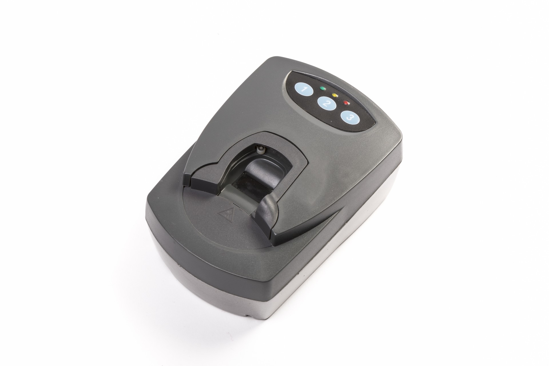 Carregador de bateria portátil cinzento e preto sobre fundo branco