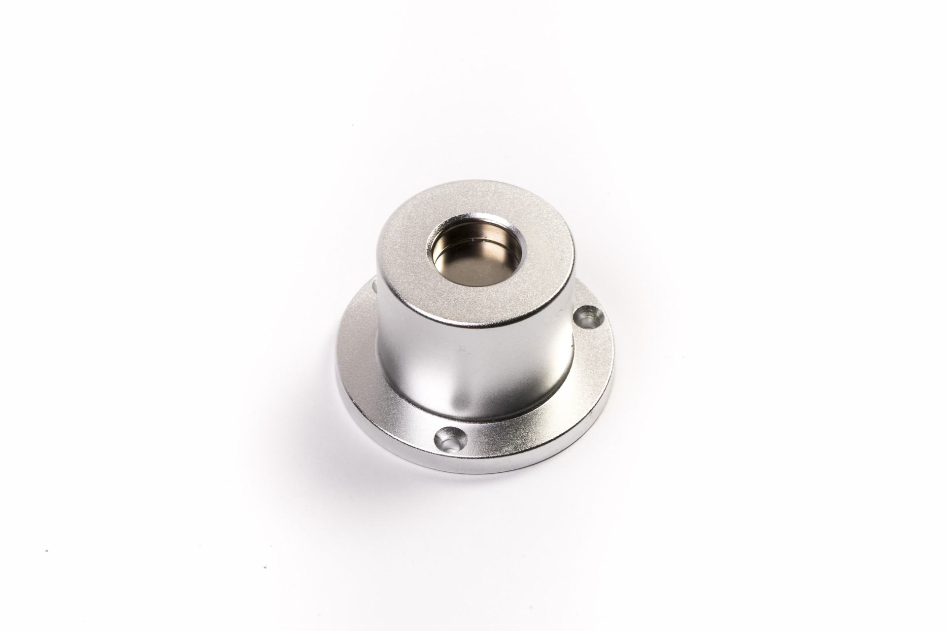 Peça metálica cilíndrica prateada com base circular e três furos para fixação