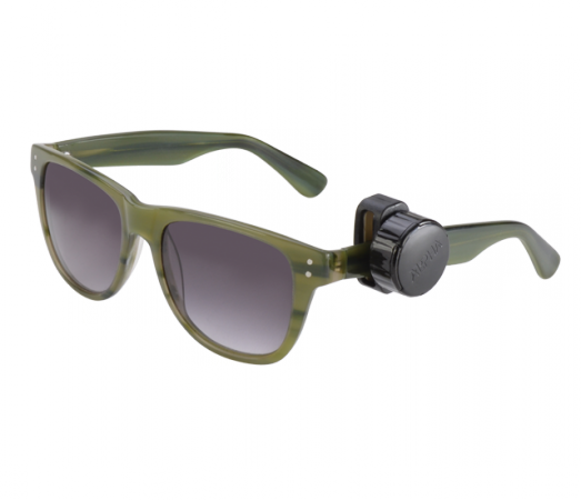 Óculos de sol verdes com lentes escuras e acessório preto na haste