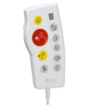 Pera de paciente, com botão de chamada de enfermeira, botão de chamada de auxiliar, controlo de Iluminação, rádio, televisão e intercomunicação de alta e baixa voz.