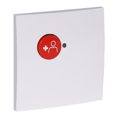 Painel branco com botão vermelho e ícone de pessoa com cruz branca