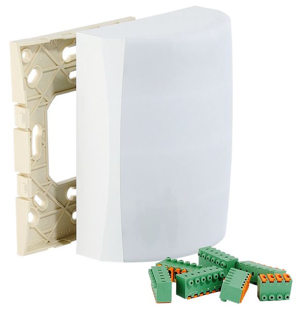 Dispositivo elétrico branco com conectores verdes e suporte bege